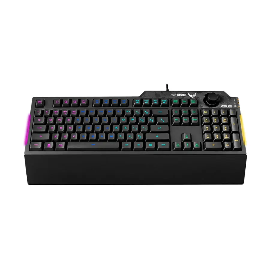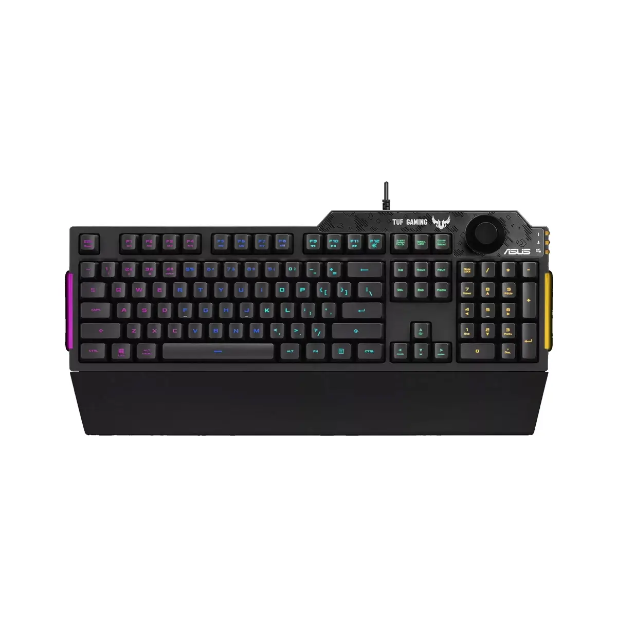 ASUS TUF Gaming K1 RGB keyboard with dedicated volume knob, spill-resistance, side light bar and Armoury Crate, Tactile TUF Gaming switches with 19-key rollover for responsive, reliable performance. Dynamic RGB lighting effects and side-mounted light bar to illuminate your game. Dedicated volume knob for fast and easy audio adjustment. Durable, reinforced plastic frame with up to 300 ml spill-resistance for everyday stability and reliability. Programmable keys with on-the-fly macro recording and onboard memory for personalized gameplay. Armoury Crate app provides extensive controls and an intuitive interface to make the keyboard your own. Detachable ergonomic wrist rest for extended comfort.