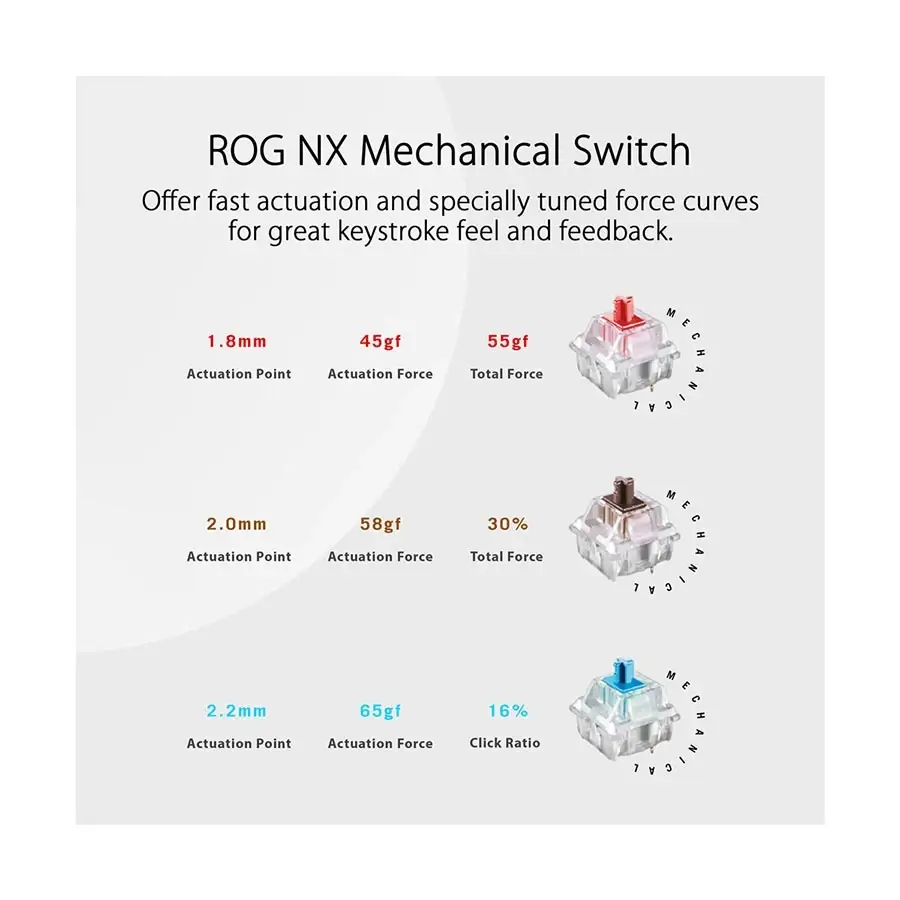 - ROG-exclusive gaming switch – ROG NX Mechanical Switch, fast actuation with ROG-tuned force curves for great keypress feel and feedback