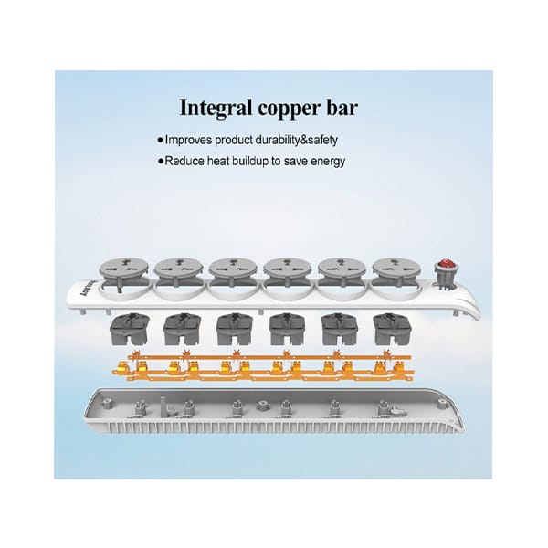 6 Universal AC Sockets: Compatible with 2-pin and 3-pin plugs, suitable for computers, TVs, chargers, routers, and more.