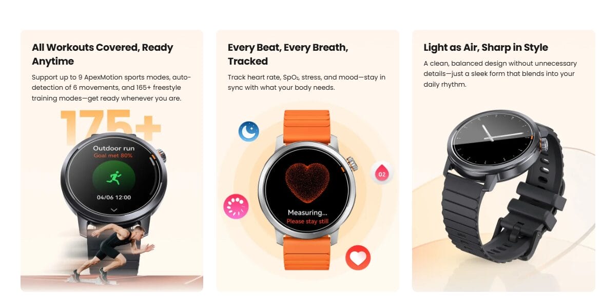 Features: AI voice assistant, music control, camera control, weather updates, smart notifications, alarm, timer, sedentary reminder