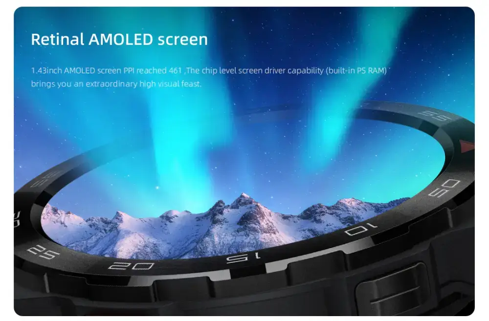 - Display: 1.43-inch AMOLED Ultra HD Always-On touchscreen
