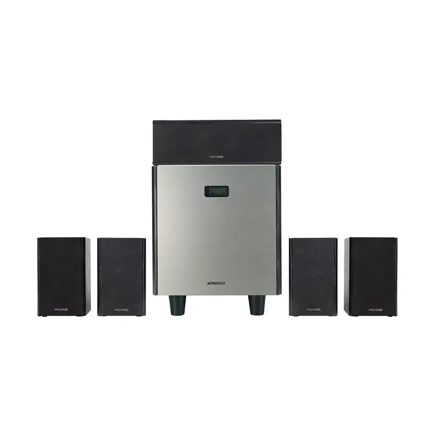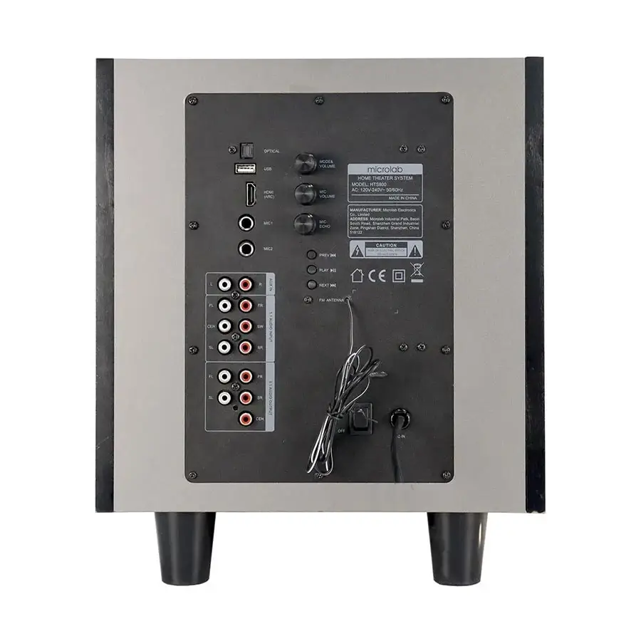 Bluetooth 5.3, High quality 5.1ch for home theater sound effects, Large 8 inch woofer for deeper bass, Satellites with midrange speaker and tweeter speaker, With HDMI(ARC) input for your TV system, With a LED screen for better operation, Supports stereo and 5.1ch audio inputs, 2 Microphone input and supports adjust mic vol & echo, With infrared remote control, FM radio and USB input.