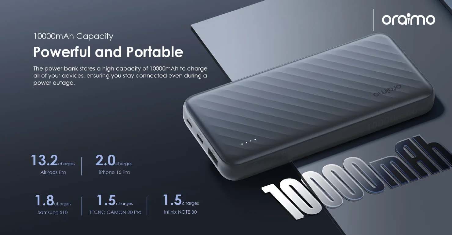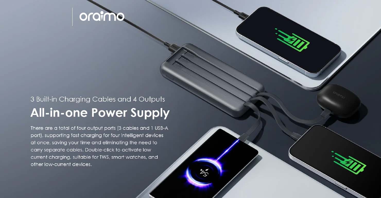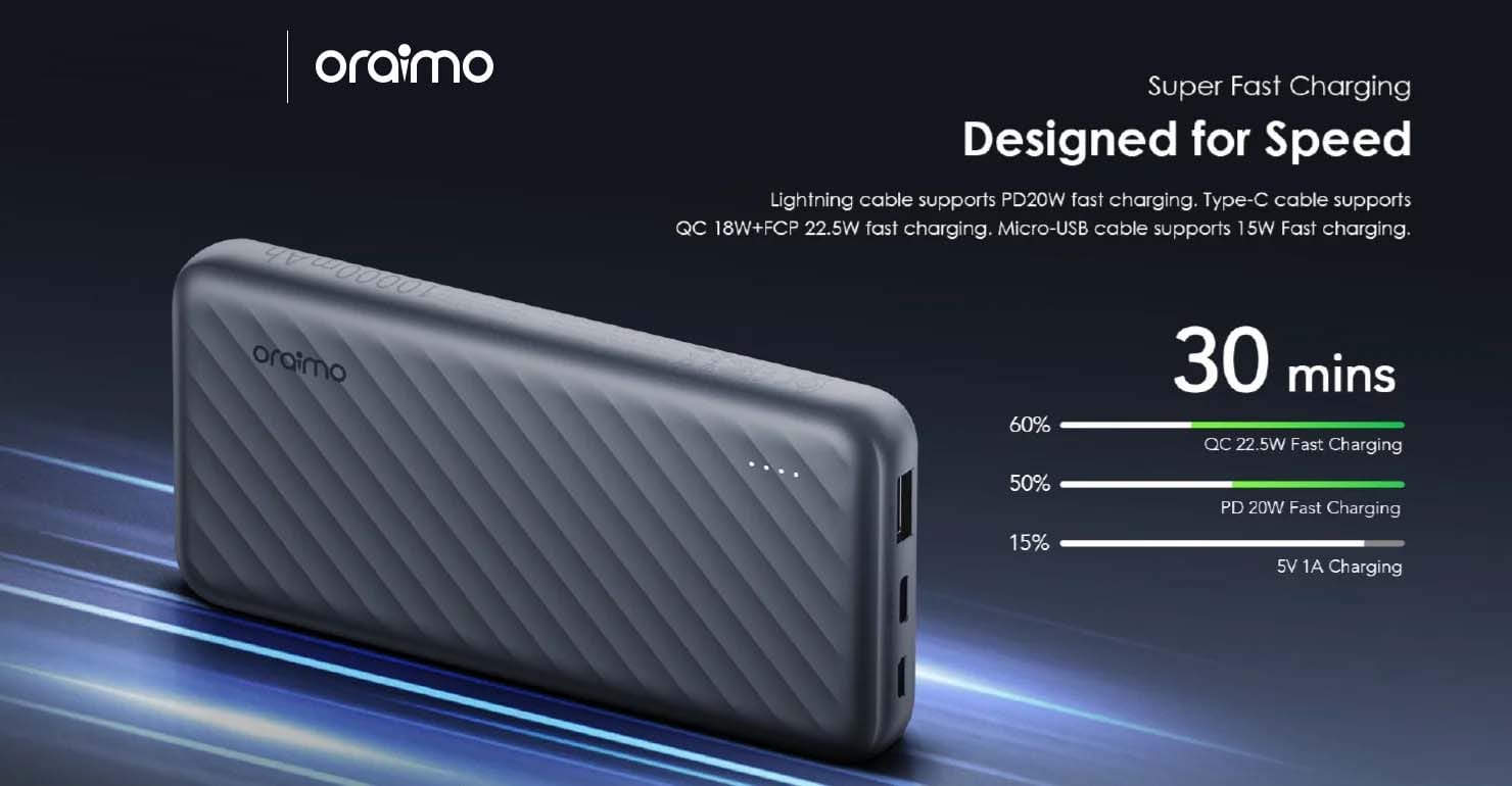 The Oraimo Slice Link Pro 10000mAh 22.5W Power Bank (OPB-P7101) is a slim, stylish, and powerful portable charger designed for fast and efficient charging. With its 22.5W super-fast charging output, it can quickly power up your smartphone, earbuds, or other devices in no time. The 10000mAh capacity ensures multiple recharges for most phones, making it perfect for travel, work, or daily use. Equipped with dual input (Type-C & Micro-USB) and dual output ports, you can charge multiple devices simultaneously. Built with advanced safety protections and a compact slice-like design, it offers both performance and portability in one.
