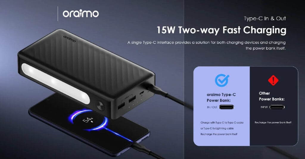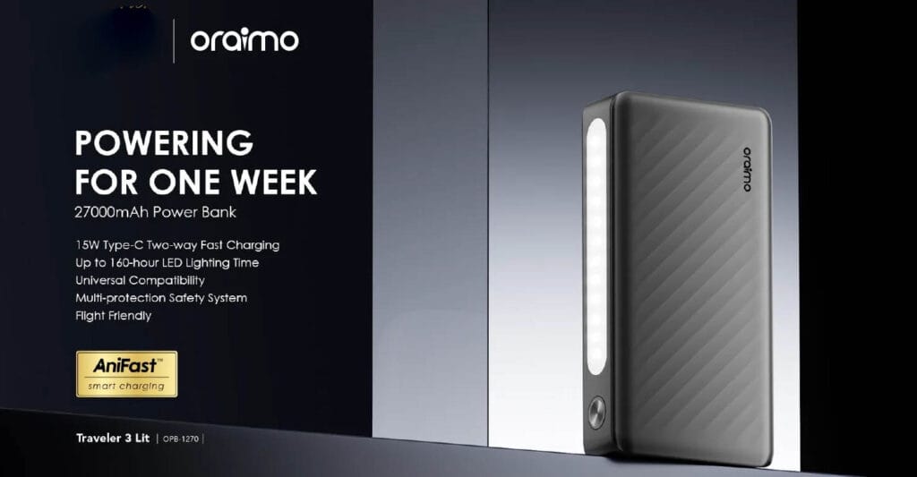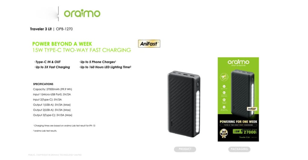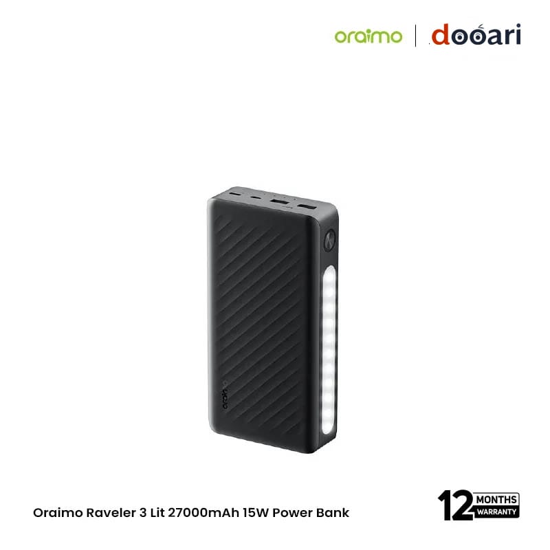 The Oraimo Traveler 3 Lit 27000mAh 15W Power Bank (OPB-1270) is a high-capacity portable charger designed to keep all your devices powered up for days. With its massive 27000mAh battery, it can recharge smartphones, tablets, and other gadgets multiple times, making it ideal for travel, outdoor adventures, and heavy daily use. The 15W fast charging output ensures quicker power delivery, while the triple output ports let you charge up to three devices simultaneously. It also comes with dual input ports (Type-C & Micro-USB) for easy recharging. Built with multi-protection safety features and a durable design, the Traveler 3 Lit is a reliable power solution for anyone on the go.