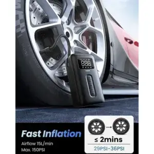 - Fast Inflation: The powerful tire inflator can quickly inflate tires; it can provide a maximum pressure of 150 PSI and an airflow of 15 L/min. Which fills a small car tire up (20-36 PSI) in 2 minutes and fully inflates bike tires (0-45 PSI) in just 3 minutes.