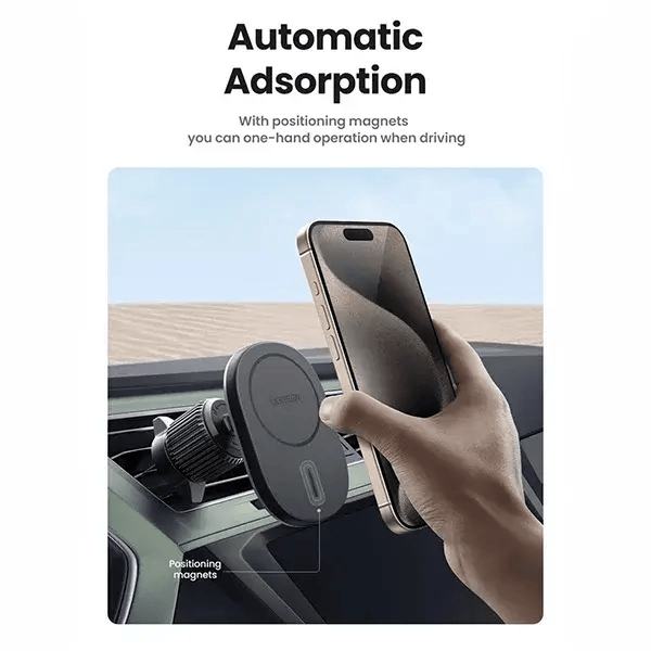 The UGREEN CD345 15W Magnetic Wireless Car Charger provides a fast, secure, and convenient charging solution for MagSafe-compatible iPhones and Qi-enabled smartphones while driving. Its strong magnetic alignment keeps your device in place even on bumpy roads, and 15W wireless fast charging ensures your phone stays powered on the go. Sleek and compact, it is perfect for any car interior.