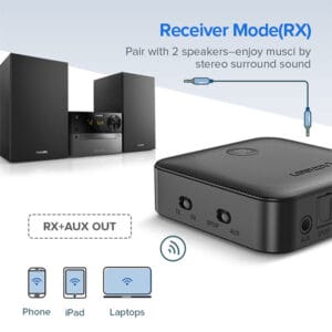 • RX Mode: Receive audio wirelessly on wired speakers, home audio systems, or car stereos