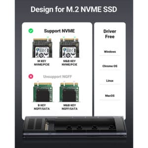 - Supported Drives: M.2 NVMe SSD (M-Key and B+M Key) sizes 2230, 2242, 2260, and 2280