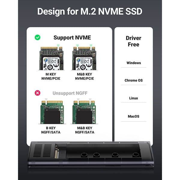 The enclosure is built with a durable aluminum alloy body that provides excellent heat dissipation to keep your SSD cool during heavy use. It offers tool-free installation for easy setup and supports most operating systems, including Windows, macOS, Linux, and Android.