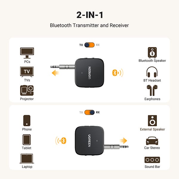 - TX Mode: Send audio from TV, PC, or console to Bluetooth headphones or speakers