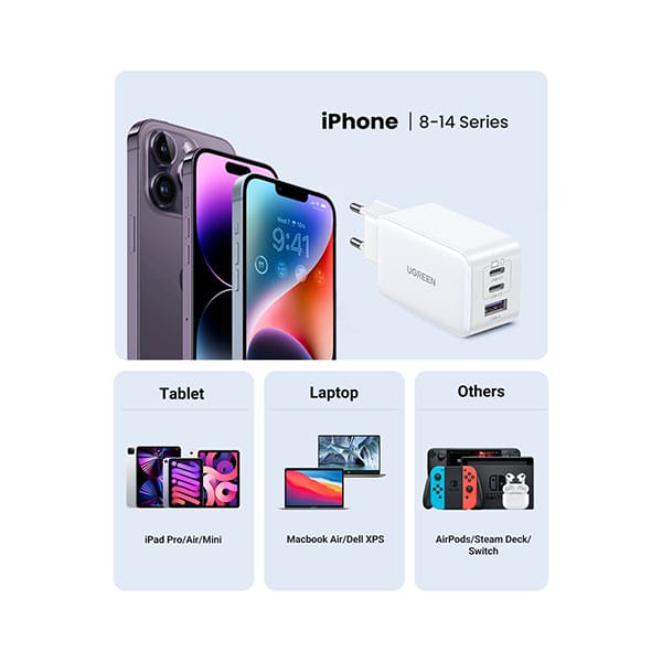 The UGREEN Nexode CD244 65W 3-Port GaN Fast Charger is a high-performance charging solution designed for laptops, tablets, smartphones, and other USB-C devices. Featuring GaN (Gallium Nitride) technology, it delivers fast and efficient charging in a compact, travel-friendly design. With two USB-C PD ports and one USB-A port, it allows for simultaneous charging of multiple devices while intelligently distributing power.