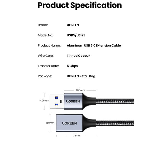 - 1 x UGREEN US115 USB-A Male to Female Extension Cable – 5M
