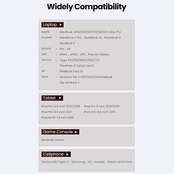 - Compatibility: MacBook, iPad, Samsung Galaxy, Xiaomi, OnePlus, Google Pixel, Power Banks, and more