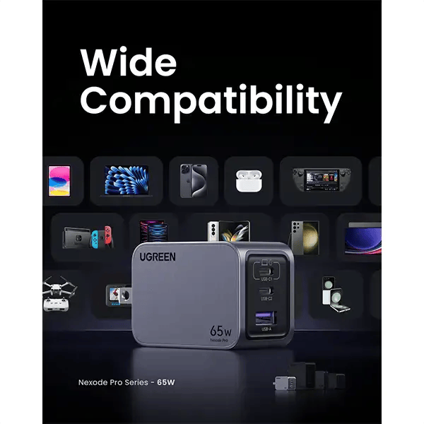 The UGREEN X755 (25870) Nexode Pro 65W 3-Port GaN Fast Charger – US is a compact, high-performance charging solution designed to power multiple devices simultaneously. Equipped with two USB-C PD ports and one USB-A port, it provides up to 65W total output, delivering fast and efficient charging for laptops, smartphones, tablets, and other USB-powered devices. The advanced GaN (Gallium Nitride) technology ensures a smaller, heat-efficient design without compromising on performance.