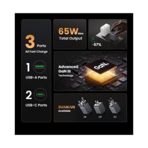 The UGREEN X755 (25871) Nexode Pro 65W 3-Port GaN Fast Charger delivers powerful and efficient charging for multiple devices at once. Equipped with the latest GaN (Gallium Nitride) technology, it offers high performance in a compact and travel-friendly design, ensuring less heat and faster charging compared to traditional chargers. With two USB-C PD ports and one USB-A port, it can power up laptops, tablets, smartphones, and more simultaneously.