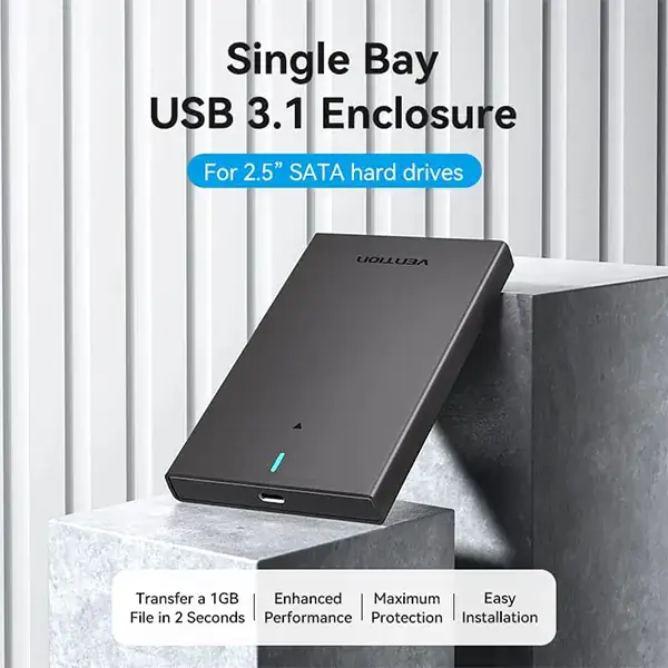 The VENTION KPBB0 2.5 Inch SATA Hard Drive Enclosure is a reliable and efficient solution for turning your internal 2.5-inch SATA HDD or SSD into a portable external drive. Designed with USB 3.0 high-speed transmission, it delivers up to 5Gbps transfer speed, making file backups, data transfers, and storage expansion faster and easier.