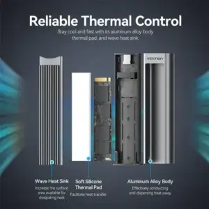 This enclosure supports M.2 NVMe PCIe SSDs (sizes: 2230/2242/2260/2280) and features a tool-free design, allowing quick and easy installation without screws. Its aluminum alloy body ensures superior heat dissipation and durability, while the compact, modern design fits comfortably in your pocket or laptop bag.