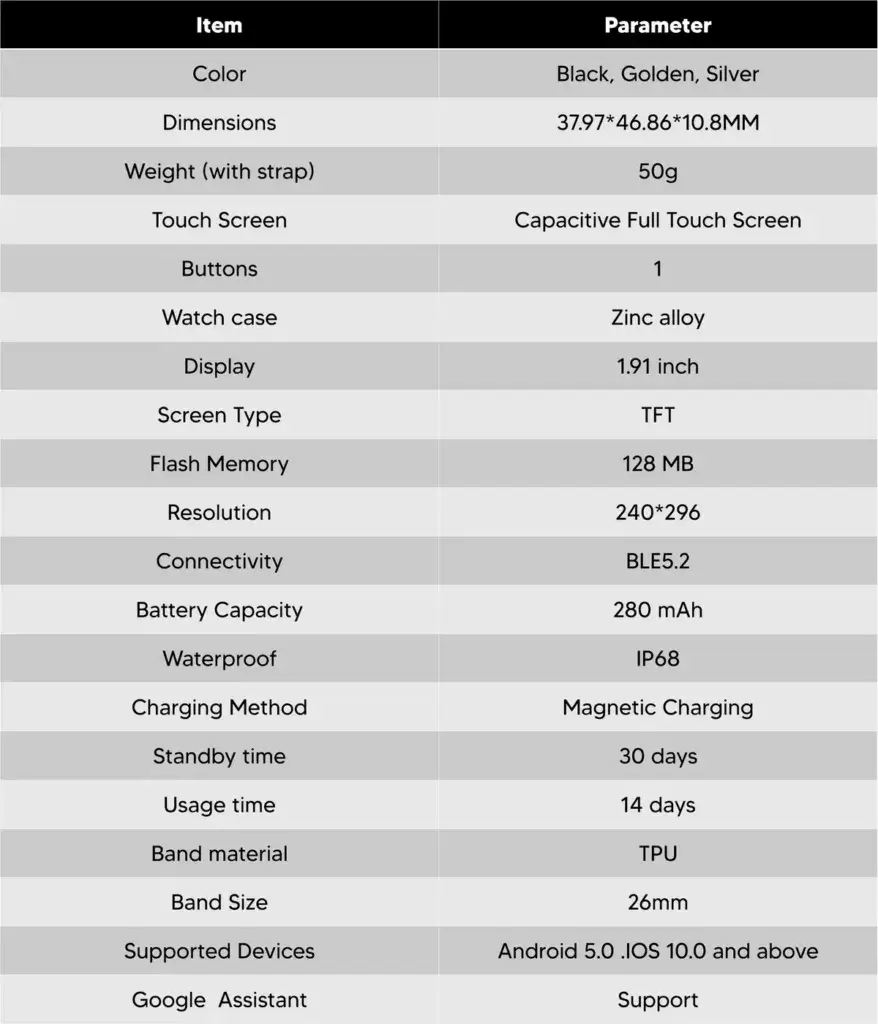 - Extra Features: Always-on display, AI voice assistant, smart notifications, music control, alarm, weather updates, sedentary reminder